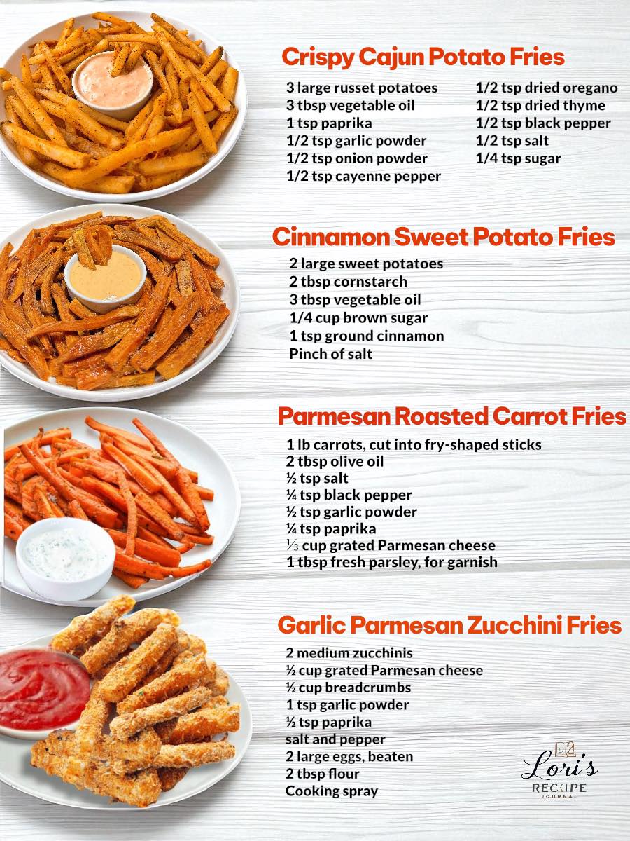 Recipes1. Crispy Cajun Potato FriesIngredients:3 large russet potatoes, cut into fries3 tablespoons vegetable oilFor the Cajun Seasoning:1 teaspoon paprika½ teaspoon garlic powder½ teaspoon onion powder½ teaspoon cayenne pepper½ teaspoon dried oregano½ teaspoon dried thyme½ teaspoon black pepper½ teaspoon salt¼ teaspoon sugar (optional, balances flavors)Instructions: