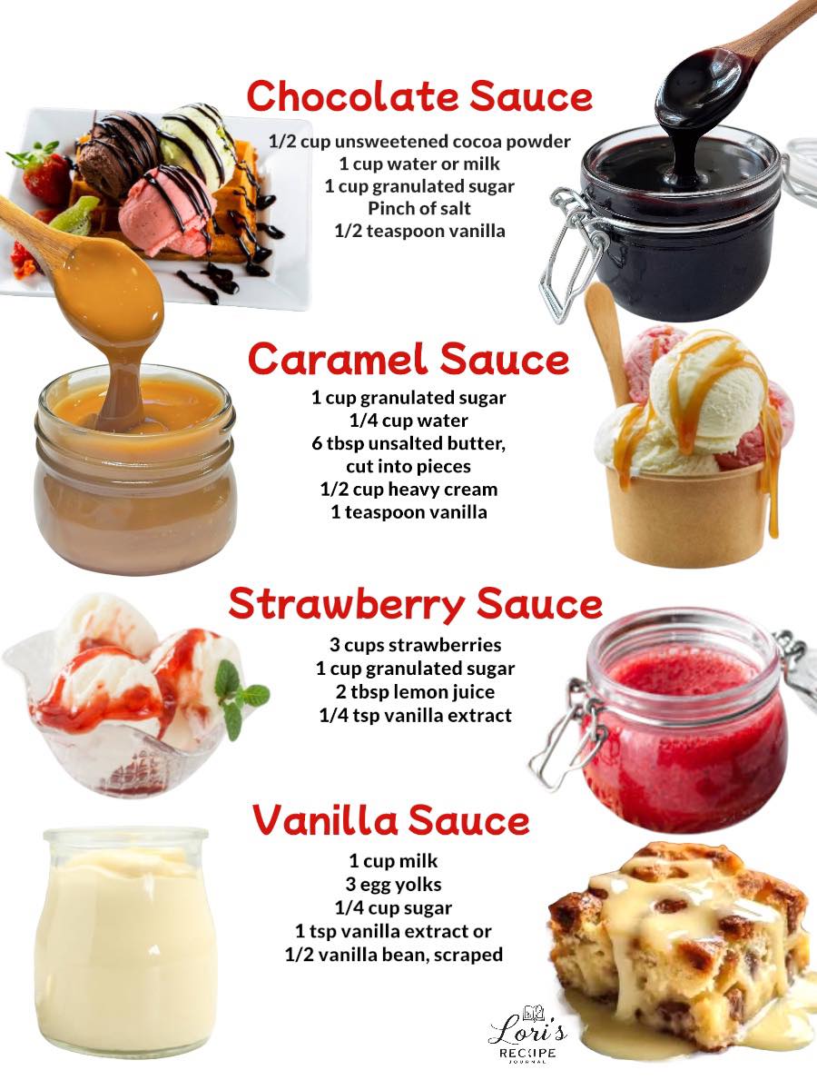 Full recipe :1. Chocolate Sauce1/2 cup unsweetened cocoa powder1 cup water1 cup granulated sugarPinch of salt1/2 teaspoon vanillaDirection:Place cocoa, water, sugar, and salt in a small saucepan. Whisk over medium-low heat until the mixture is thick and the cocoa has completely dissolved, about 3 minutes. Remove from heat and add vanilla. The chocolate sauce will … Read more