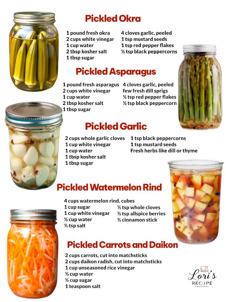 Recipes👇 1. Pickled Okra Ingredients 1 pound fresh okra, washed and trimmed 2 cups white vinegar (5% acidity) 1 cup water 2 tablespoons kosher salt 1 tablespoon sugar (optional, balances the vinegar) 4 cloves garlic, peeled 1 teaspoon mustard seeds 1 teaspoon dill seeds or a few fresh dill sprigs 1 teaspoon red pepper flakes … Read more